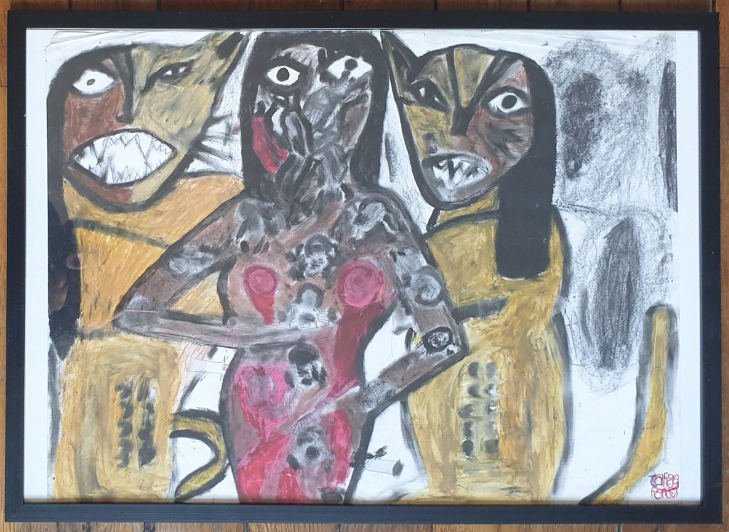 Techniques mixtes (fusain, huile en barre et acrylique) sur papier.